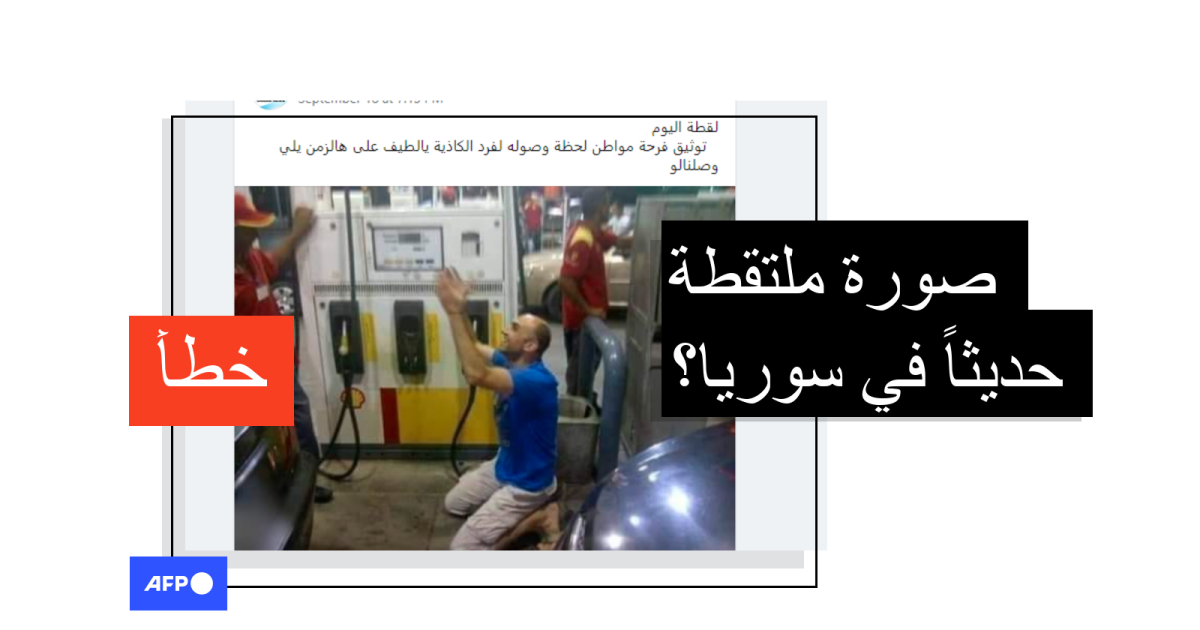 يظهر في الصورة رجلٌ مبتسمٌ راكعٌ وهو يرفع يديه نحو السماء داخل محطّة للوقود. وقد جاء في النصّ المرافق "سجود مواطن سوري بعد وصوله الى محطة المحروقات وانتظار ثلاثة أيام في طابور البنزين".
