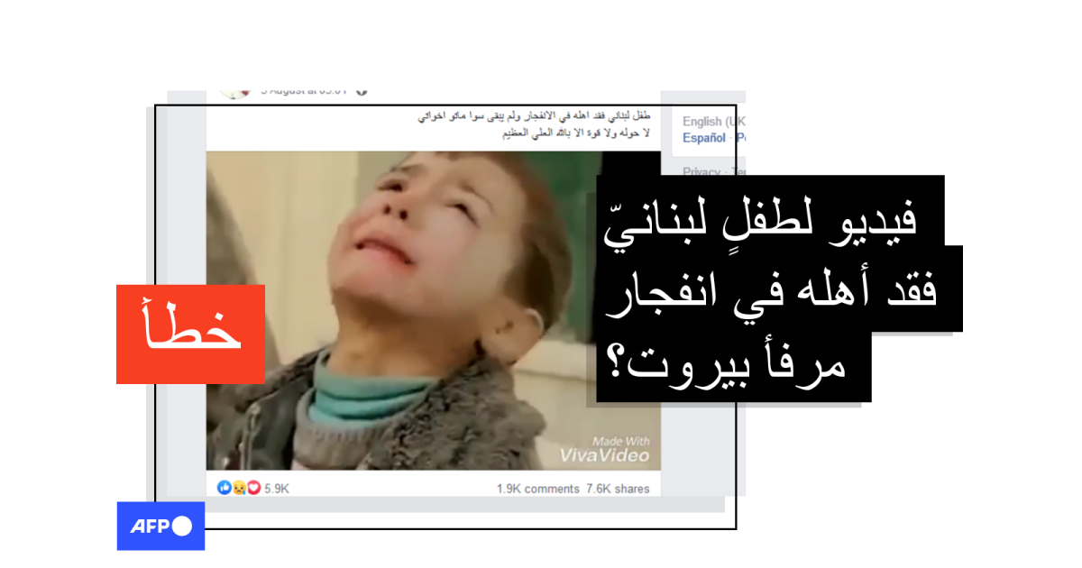 يتداول مستخدمون لمواقع التواصل الاجتماعي فيديو يدّعي ناشروه أنه لصبي يبكي بعد أن فقد أهله في انفجار مرفأ العاصمة اللبنانية بيروت. لكنّ الفيديو في الحقيقة يظهر طفلاً سورياً يبكي اخوته الذين قضوا في قصف للقوات النظامية السورية على مدينة حلب عام 2014 بالبراميل المتفجّرة.