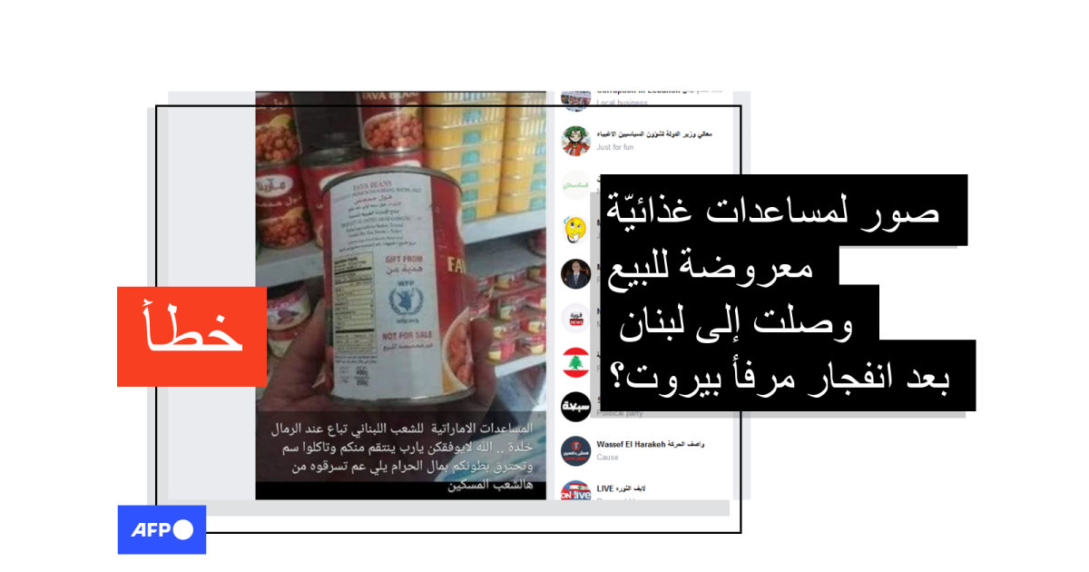 تبدو في الصورة علبة فول تحمل إشارة "غير مخصصة للبيع" إلى جانب شعار "برنامج الأغذية العالمي"، وجاء في النصّ المرافق لها "المساعدات الإماراتية للشعب اللبناني تباع عند الرمال (متجر لبناني)... يا رب ينتقم منكم وتحترق بطونكم بمال الحرام".