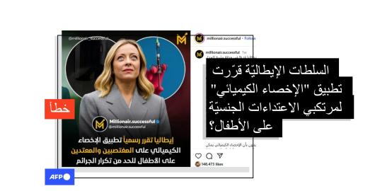 الصورة تاريخ النشر 08/08/2025 المنشورات عن إقرار السلطات الإيطالية "الإخصاء الكيميائي" على مرتكبي الاعتداءات الجنسيّة على أطفال غير صحيحة