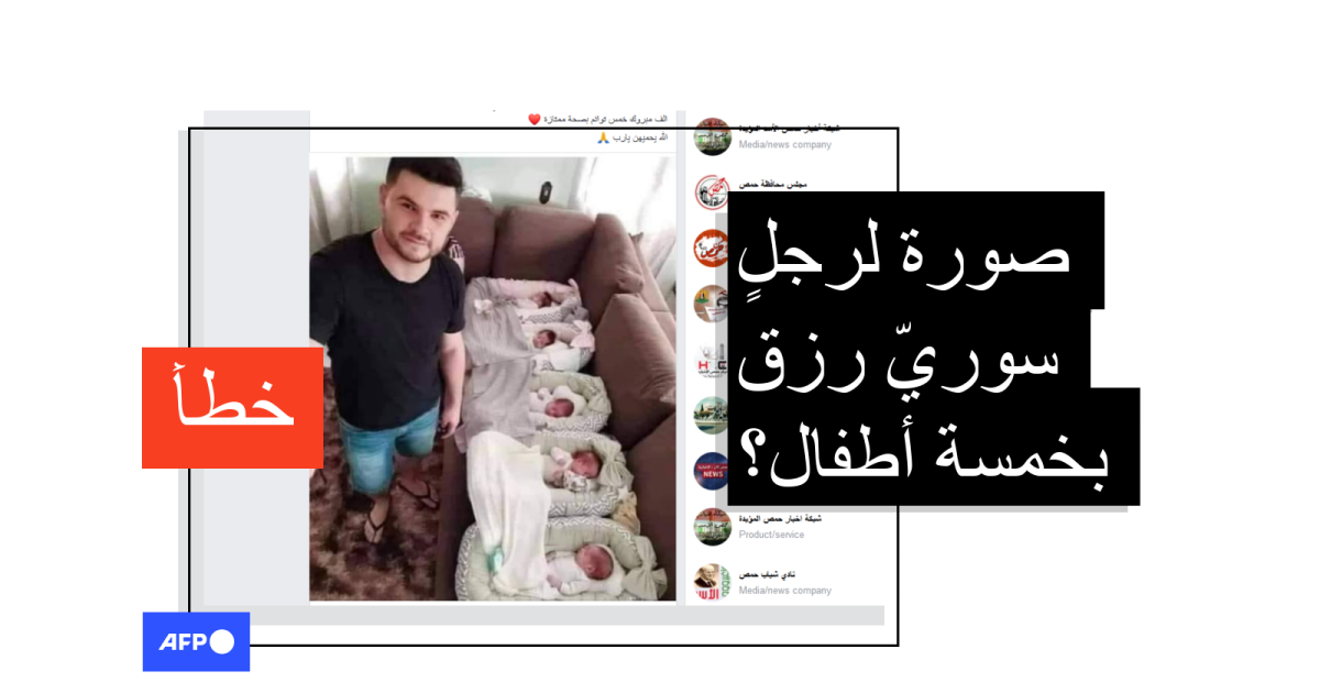يبدو في الصورة رجلٌ مبتسمٍ إلى جانب خمسة أطفال حديثي الولادة، وقد جاء في النصّ المرافق لها "ألف مبروك للشاب السوري علي عيسى وعروسته أميمة…".