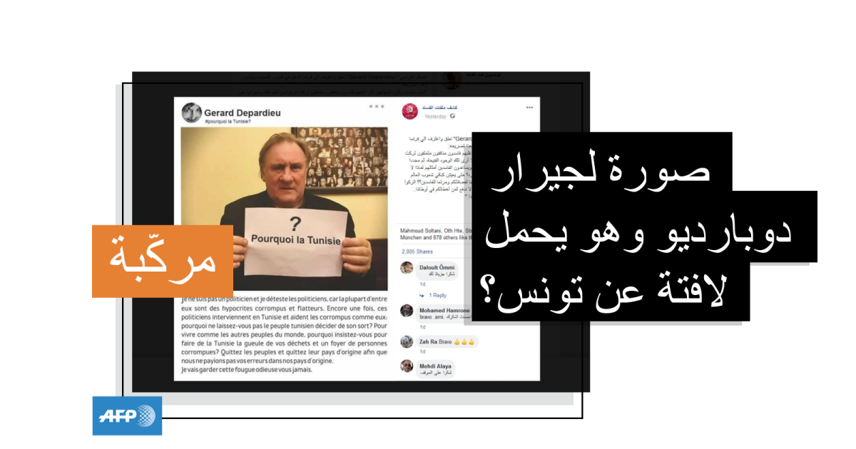 وجاء في التعليق المرافق للمنشور "الممثل الفرنسي Gerard Depardieu نطق واعترف أنّ فرنسا تتدخل في شؤون الشعوب وتونس"، بالإضافة إلى ترجمة النصّ الفرنسي الظاهر تحت الصورة على الشكل التالي "لست سياسيا وأكره السياسيين لأن أغلبهم فاسدون منافقون متملقون...هؤلاء يتدخلون في تونس ويساعدون الفاسدين أمثالهم... لماذا لا تتركون الشعب التونسي يقرر مصيره… لماذا تصرون على جعل تونس مصباً لفضلاتكم ومرتعاً للفاسدين..".