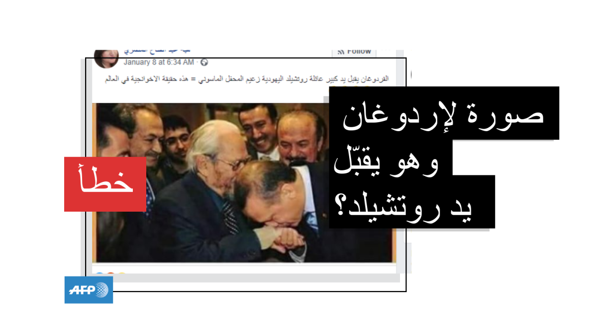 يبدو في الصورة إردوغان وهو يقبّل يد رجلٍ مسنٍ وهو محاط بعدد من الأشخاص، وجاء في النصّ المرافق لها "إردوغان يقبّل يد كبير عائلة روتشيلد اليهودية زعيم المحفل الماسوني..هذه حقيقة الإخوان في العالم أجمع".