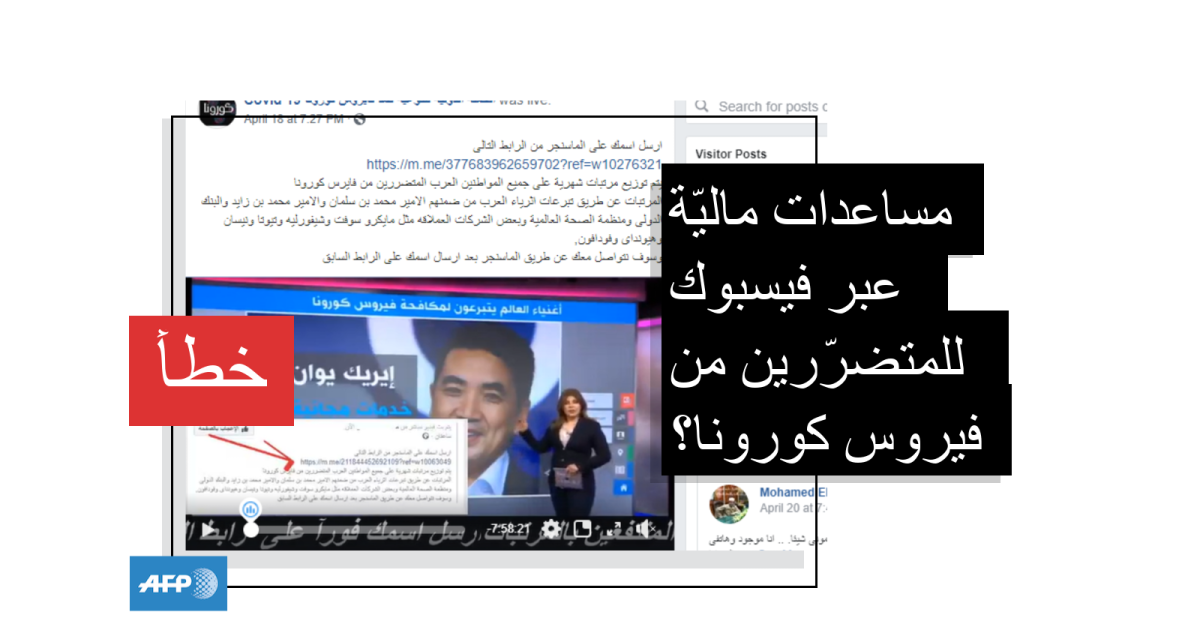 نشرت مجموعة من الصفحات على موقع فيسبوك فيديوهات بثّ مباشر تتحدّث عن توزيع مرتّبات شهريّة "على جميع المواطنين العرب المتضررين من فيروس كورونا عن طريق تبرعات أثرياء العرب ومنظمة الصحة العالميّة وبعض الشركات العملاقة".