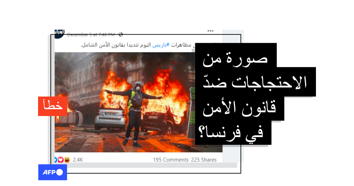يبدو في الصورة متظاهر يرفع علامة النصر أمام ثلاث سيارات محترقة، وقد جاء في النصّ المرافق "صورة من تظاهرات باريس اليوم تنديداً بقانون الأمن الشامل".