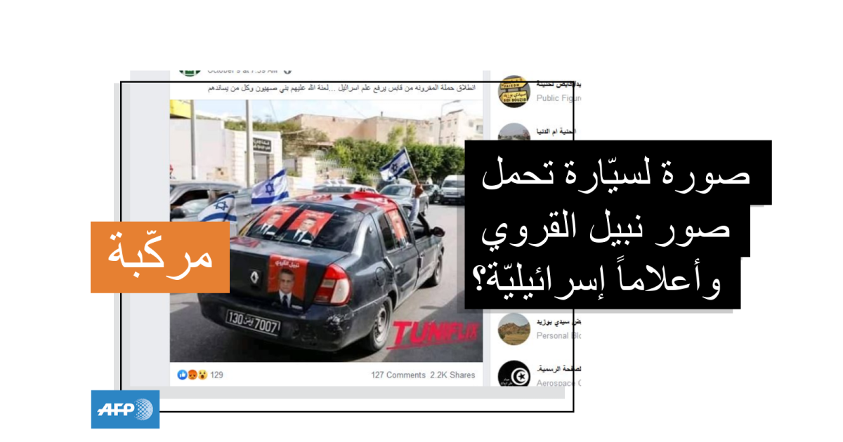 تظهر في الصورة سيّارة تحمل لوحة تسجيل تونسيّة، ألصقت عليها صورٌ لرئيس حزب "قلب تونس" نبيل القروي ويبدو أنّ من في داخلها يحملون أعلاماً اسرائيليّة. وجاء في التعليق المرافق "انطلاق حملة المقرونه من قابس يرفع علم إسرائيل …".