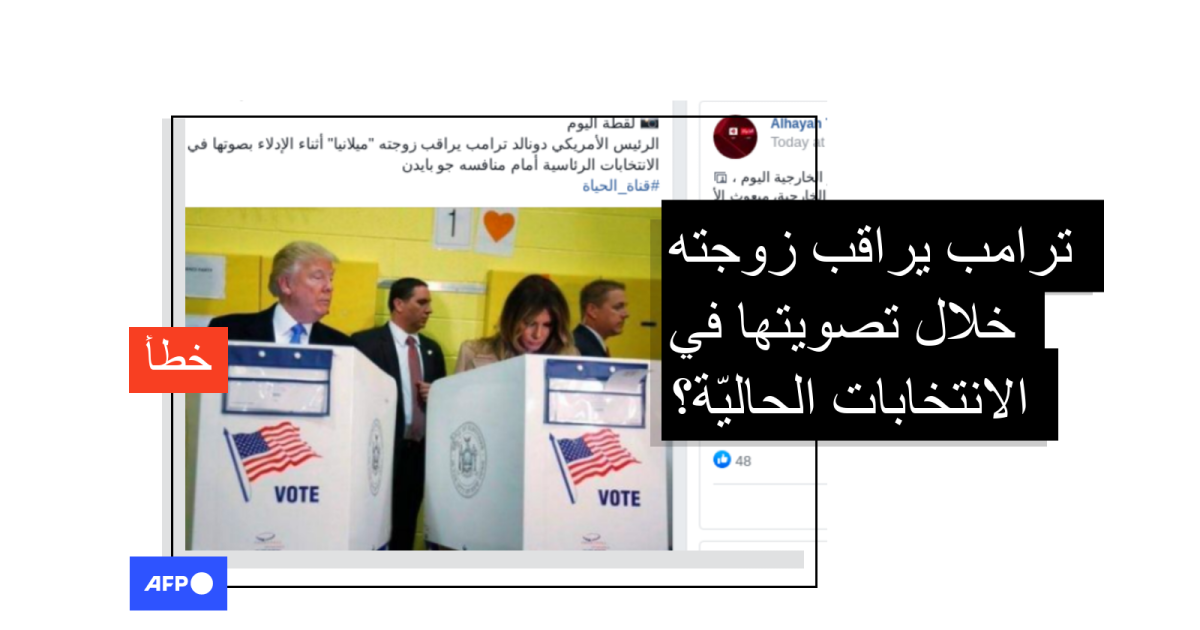 وقد جاء في النصّ المرافق لها "الرئيس الأميركي دونالد ترامب يراقب زوجته ميلانيا أثناء الإدلاء بصوتها في الانتخابات الرئاسية أمام منافسه جو بايدن".