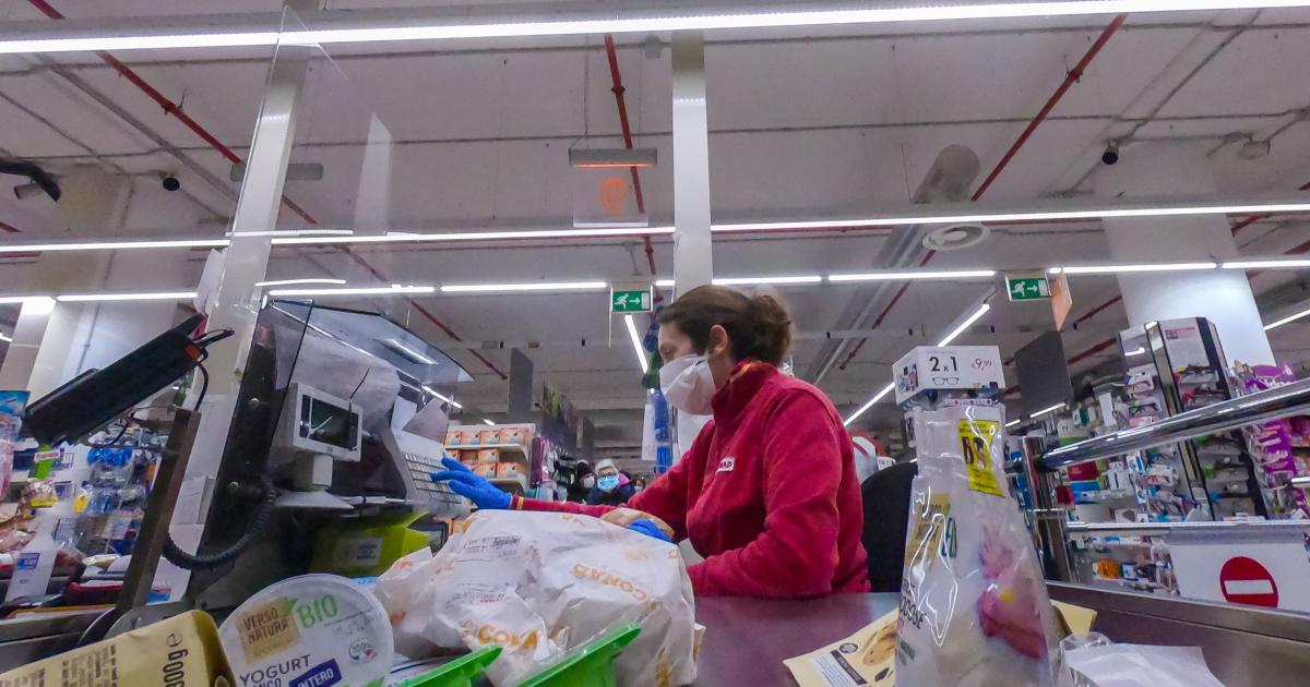 وبحسب مصوّر فرانس برس، تُظهر الصورة موظّفة على الصندوق في متجر في روما يوم السادس والعشرين من آذار/مارس 2020، وذلك في ظلّ تفشيّ الموجة الأولى من كورونا.