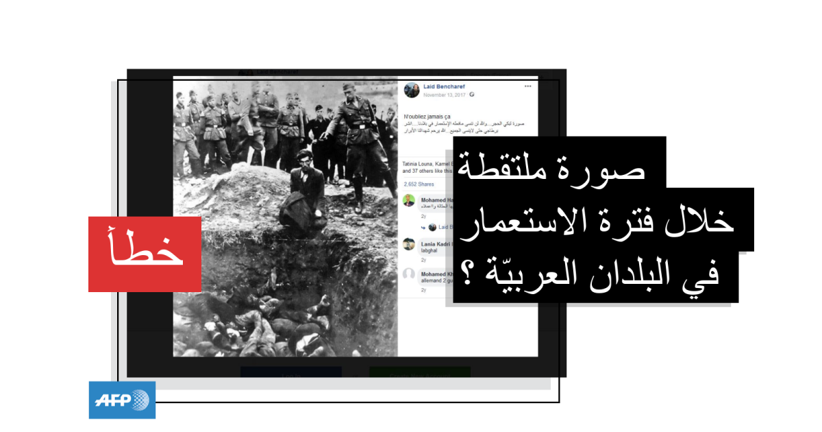 لكنّ الصورة المتداولة لم تلتقط خلال الاستعمار الفرنسي، فقد أرشد البحث عن الصورة عبر محرّك غوغل إلى الصورة نفسها منشورة على موقع "غيتي". وقد جاء في النصّ المرافق لها "جندي من وحدة Einsatzgruppe D (فرقة نازيّة مهمّتها إبداة اليهود) على وشك إطلاق النار على يهودي راكع فوق مقبرة جماعية مملوءة جزئياً في مدينة فينيتسا بجمهورية أوكرانيا الاشتراكية السوفياتية (الاتحاد السوفياتي) عام 1942".