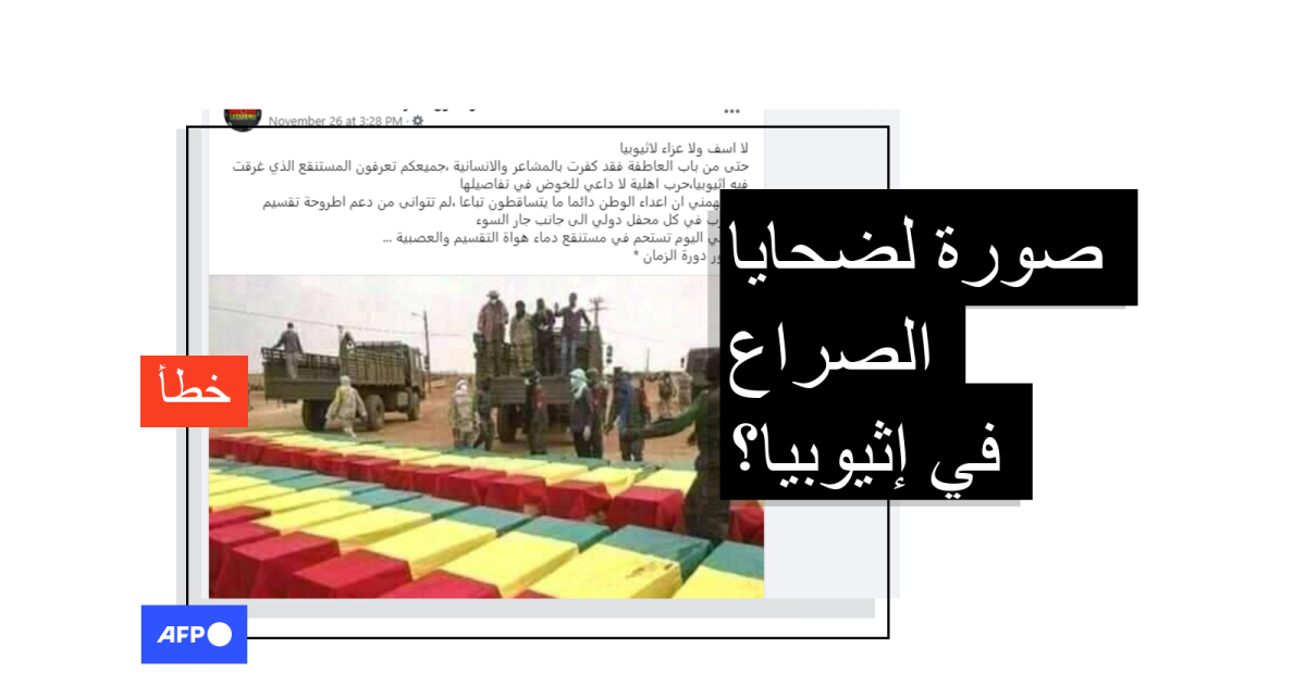 تبدو في الصورة عشرات النعوش الملفوفة بعلمٍ ألوانه أحمر وأخضر وأصفر، وإلى جانبها شاحنات عسكريّة. وقد جاء في النصّ المرافق "لا أسف ولا عزاء لإثيوبيا... جميعكم تعرفون المستنقع الذي غرقت فيه... حرب أهلية لا داعي للخوض في تفاصيلها".