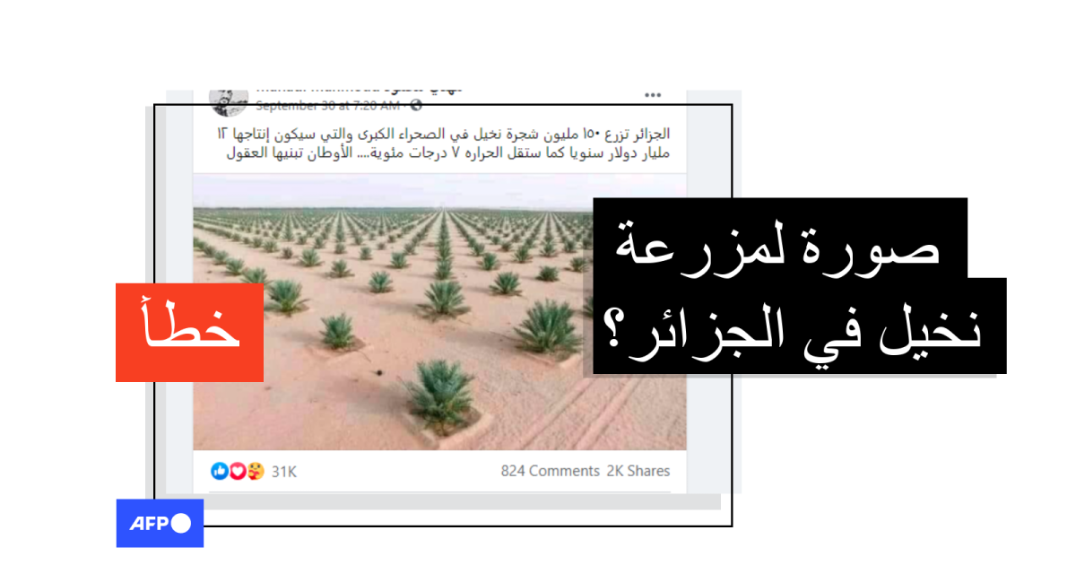تظهر في الصورة آلاف أشجار النخيل الصغيرة مزروعة بشكل متّسق على امتداد مساحة واسعة. وقد جاء في النصّ المرافق "الجزائر تشرع في غرس 150 مليون نخلة في الصحراء الكبرى من منطقة تسابيت الى رڨان" وأضاف المنشور أنّ إنتاج التمور سيدرّ 12 مليار دولار على البلاد ويخفّض درجة الحرارة.