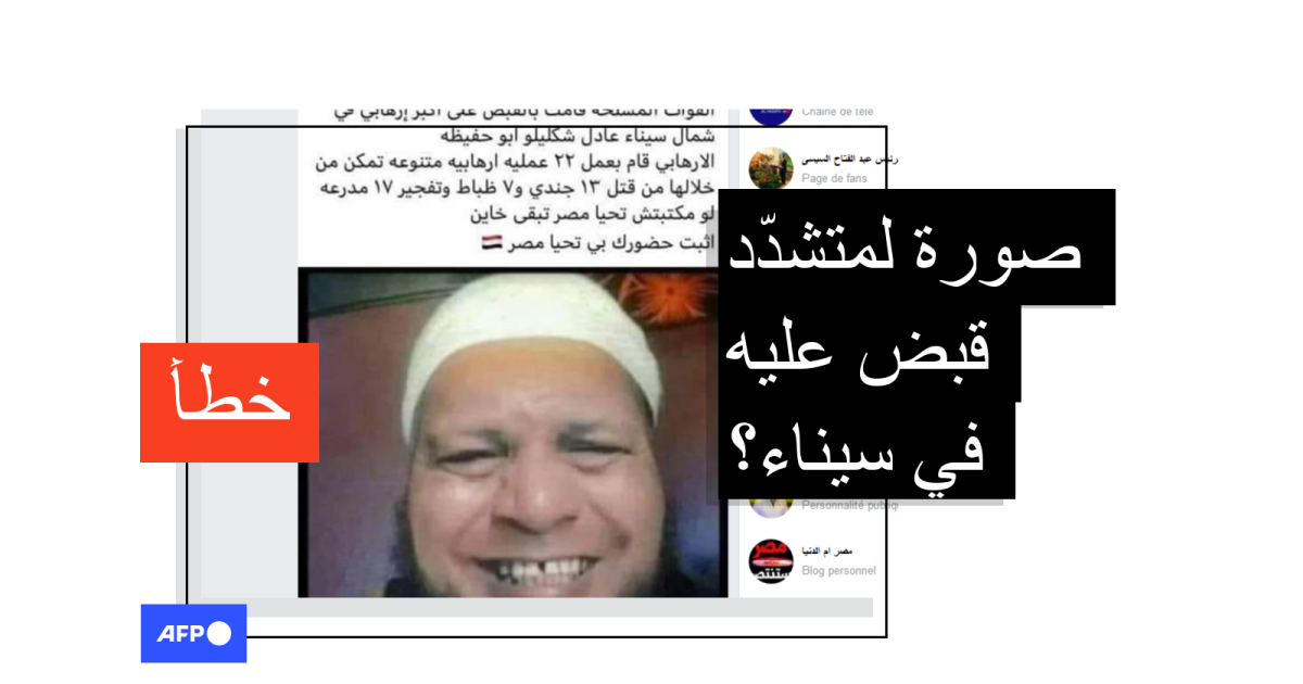 يبدو في الصورة رجلٌ ملتحٍ وهو يبتسم وقد جاء في النصّ المرافق له "عاجل القوات المسلّحة قامت بالقبض على أكبر إرهابي في شمال سيناء عادل شكليكو أبو حفيظة...الإرهابي نفّذ 22 عمليّة متنوعة قتل خلالها 13 جندياً و7 ضباط وتفجير 13 مدرّعة…إذا لم تكتب تحيا مصر تكون خائناً".