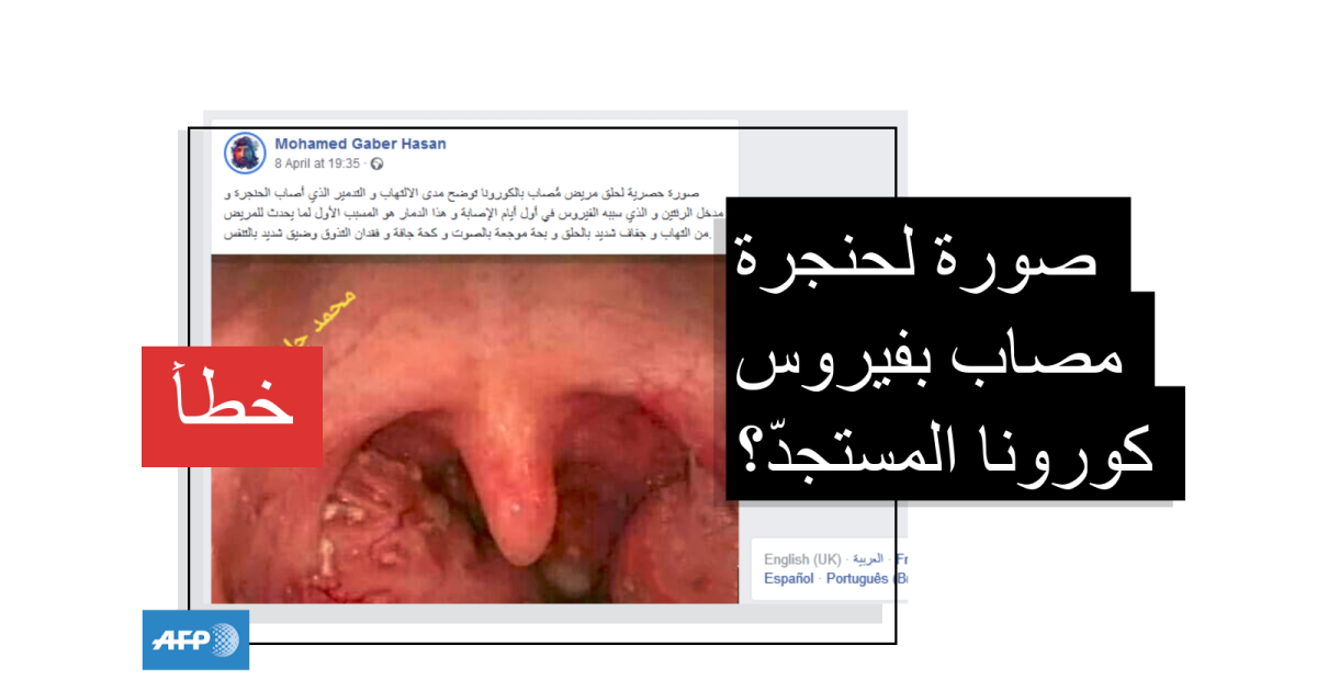 تظهر في الصورة حنجرة يبدو أنّها متورّمة أو ملتهبة. وجاء في النصّ المرافق لها "صورة حصريّة لحلق مريض مُصاب بالكورونا توضح مدى الالتهاب والتدمير الذي أصاب الحنجرة ومدخل الرئتين...هذا الدمار هو المسبّب الأول لما يحدث للمريض من جفاف شديد بالحلق وبحّة موجعة بالصوت وكحّة جافة …".