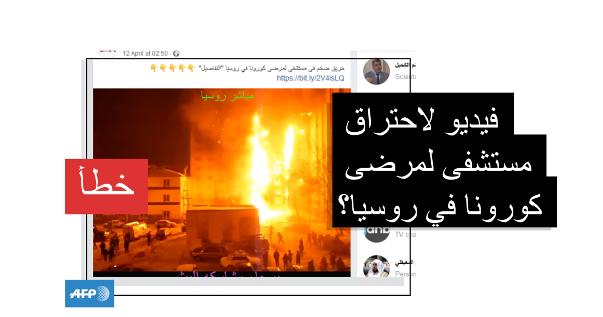 يظهر في الفيديو حريق ضخم في بناء مرتفع ويُسمع صوت سيارات الإسعاف والإطفاء. نشر الفيديو بخاصية البث المباشر وتكررت المشاهد نفسها لمدة ثماني ساعات. وقد جاء في النصّ المرافق له "حريق ضخم في مستشفى لمرضى كورونا في روسيا"، حيث سُجّلت أكثر من 24 ألف إصابة بفيروس كورونا المستجدّ وأكثر من 12 ألف وفاة.