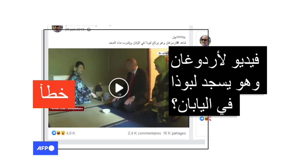 يتداول مستخدمون لموقع فيسبوك فيديو يدّعي ناشروه أنّه يظهر الرئيس التركي رجب طيّب أردوغان وهو يسجد لبوذا في اليابان. لكنّ الفيديو في الحقيقة يظهر مشاركة أردوغان في احتفالٍ تقليديّ لشرب الشاي على هامش مشاركته في قمّة العشرين في اليابان السنة الماضية.