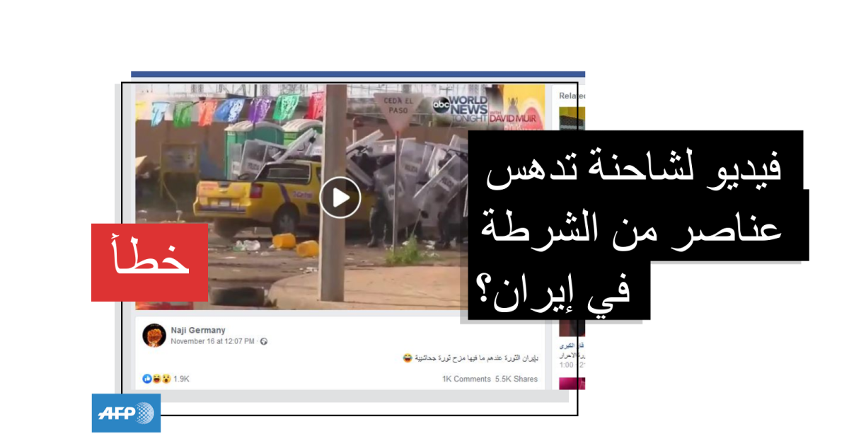 يتداول مستخدمون لفيسبوك فيديو يدّعي ناشروه أنّه يظهر شاحنة يقودها متظاهر إيراني تدهس عناصر من شرطة مكافحة الشغب، في وقت كانت الجمهورية الإسلامية تشهد موجة احتجاجات. لكنّ الفيديو في الحقيقة ملتقط في المكسيك ويعود إلى العام 2017.