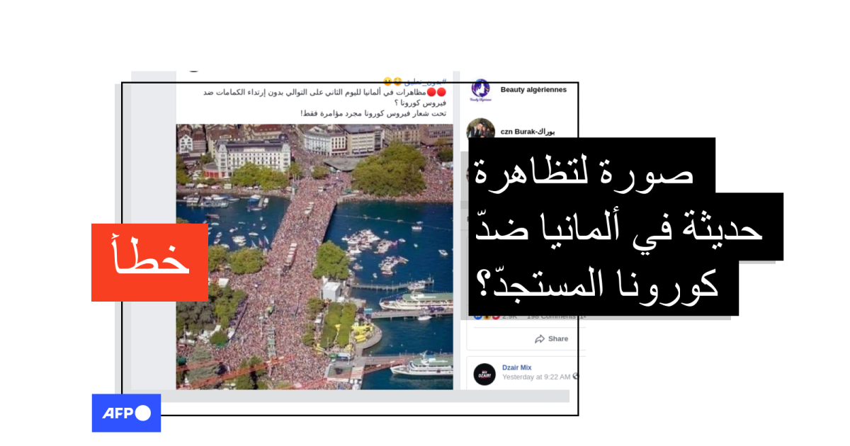 يظهر في الصورة الملتقطة من الجو عشرات آلاف الأشخاص يشاركون في تظاهرة أو مسيرة على ما يبدو، وجاء في النصّ المرافق لها "تظاهرات في ألمانيا لليوم الثاني على التوالي بدون ارتداء الكمامات ضد فيروس كورونا...تحت شعار فيروس كورونا مجرّد مؤامرة فقط!".