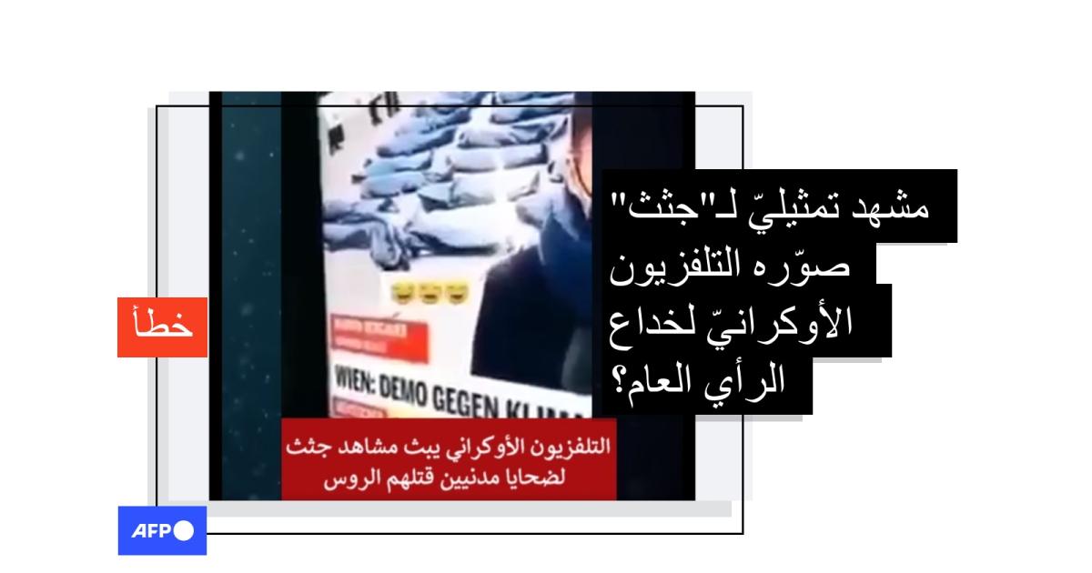 يتداول مستخدمون لمواقع التواصل الاجتماعي مقطع فيديو يصوّر شخصاً يتحرّك داخل كيس للجثث على أنّه يفضح خدعة قام بها التلفزيون الأوكراني لإقناع الرأي العام بأنّ روسيا تقصف مدنيين. إلاّ أنّ الفيديو يصوّر في الحقيقة وقفة احتجاجيّة قام بها نمسايون في الرابع من شباط/فبراير 2022 اعتراضاً على السياسة المناخيّة في بلادهم.