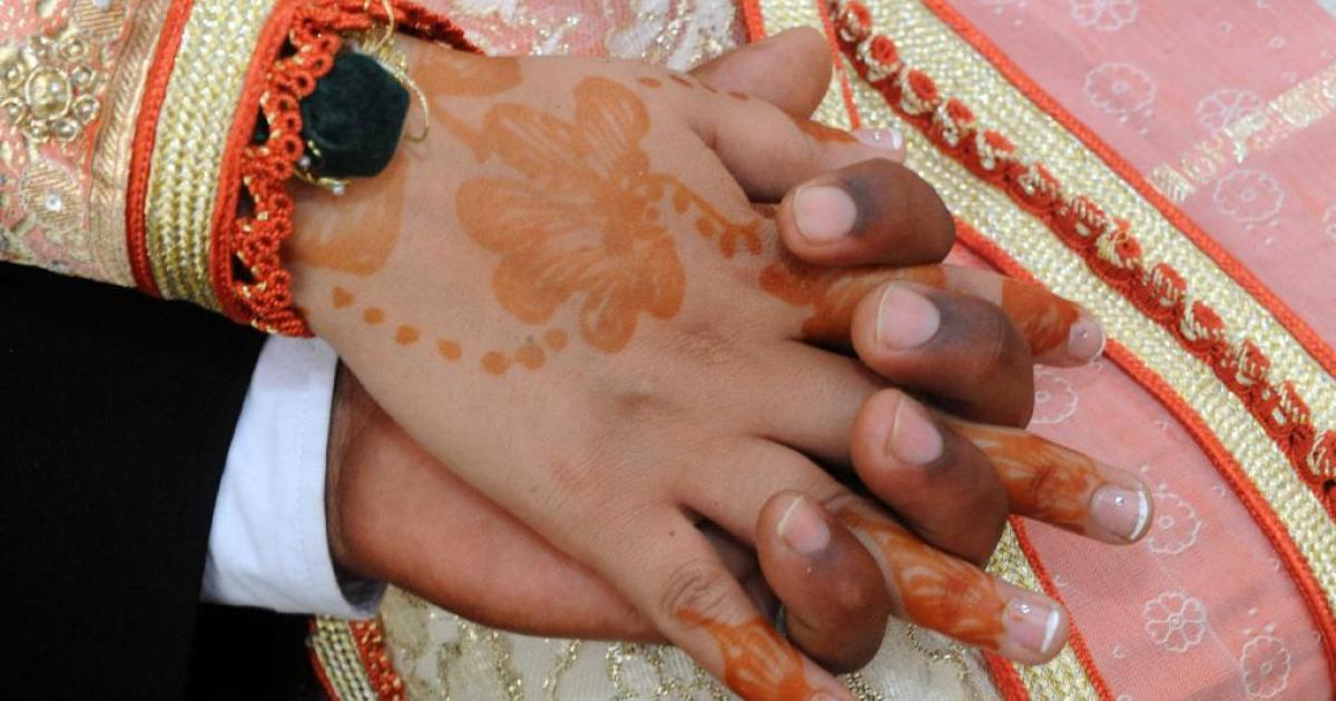 تظهر في الصورة بطاقة صغيرة تُحمل بالكفّ، كُتب عليها "المملكة المغربية- وزارة العدل- عقد زواج".