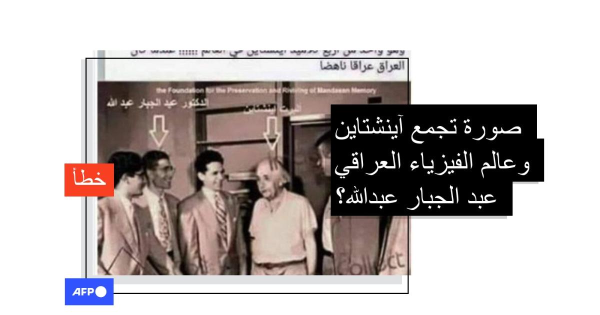 يبدو في الصورة عالم الفيزياء ألبرت آينشتاين محاطاً بخمسة رجال. وكتب على الصورة نفسها "صورة نادرة تجمع العالم آينشتاين بعالم الفيزياء العراقي عبد الجبار عبدالله، وهو أول رئيس لجامعة بغداد وأحد طلاب آينشتاين..." مع سهمين للإشارة إلى آينشتاين وعبدالله.