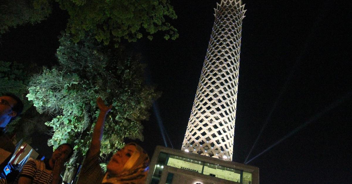 يظهر في الصورة ما يبدو أنه برج القاهرة، وإلى جانبه ما يبدو أنه رجل يسقط في الهواء.