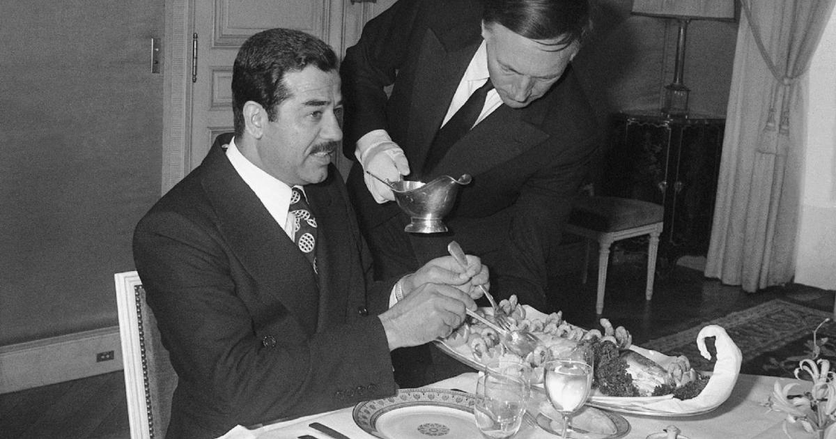يظهر في الصورة - بالأسود والأبيض - صدّام حسين على ما يبدو أنها مائدة طعام، وإلى جانبه رجل يتولّى الخدمة.