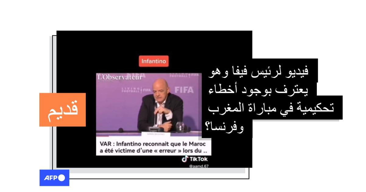 لكن الفيديو المتداول على مواقع التواصل، والذي يتحدّث فيه إنفانتينو عن تقنية حكم الفيديو المساعد (في إيه آر) لا شأن له بمباراة المغرب وفرنسا الأخيرة.