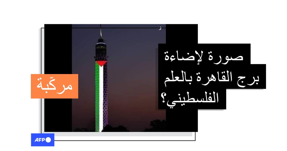 هذه الصورة مركّبة ولا تظهر إضاءة برج القاهرة بالعلم الفلسطيني