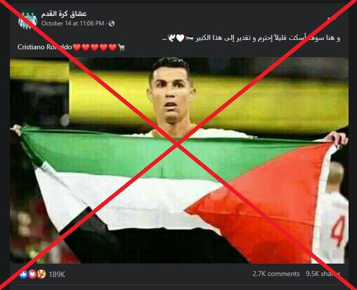 هذه الصورة لرونالدو حاملاً العلم الفلسطيني مركّبة وهي في الحقيقة للاعب المغربي جواد الياميق
