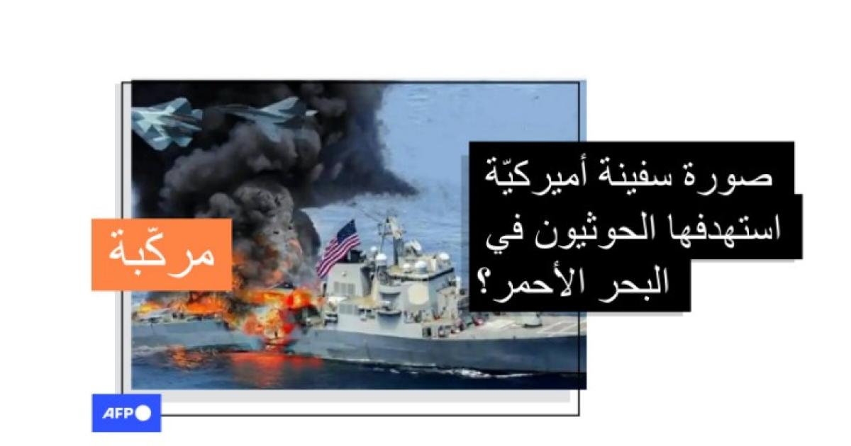 هذه الصورة التي قيل إنها لسفينة أميركيّة استهدفها الحوثيون في البحر الأحمر مركّبة