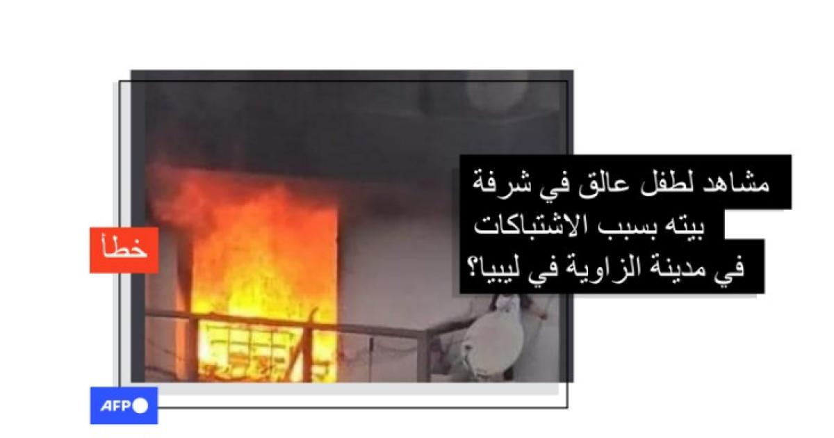 وجاء في التعليقات المرافقة أن المشاهد تُظهر طفلاً عالقاً على شرفة منزله بعد سقوط قذيفة واشتعال البيت فيها بسبب الاشتباكات التي اندلعت السبت في مدينة الزاوية في ليبيا.