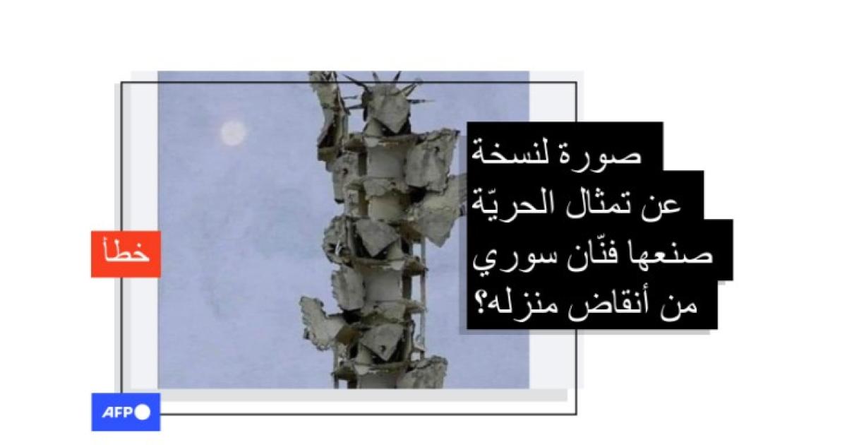 هذه الصورة ليست لنسخة عن تمثال الحريّة بناها فنان سوري من أنقاض منزله