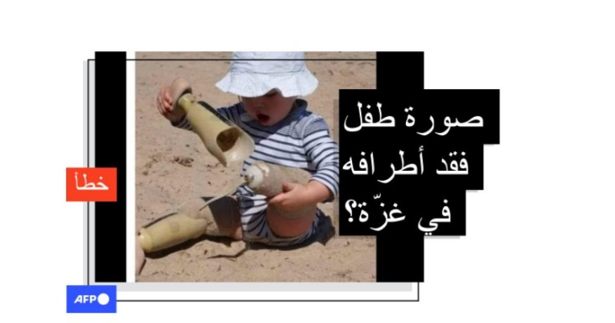يبدو في صورة المنشور طفل يجلس على الرّمال يمسك بيديه طرفاً اصطناعياً. وقال ناشرو الصورة إنها لطفل من غزّة مذكّرين بالمعاناة هناك.