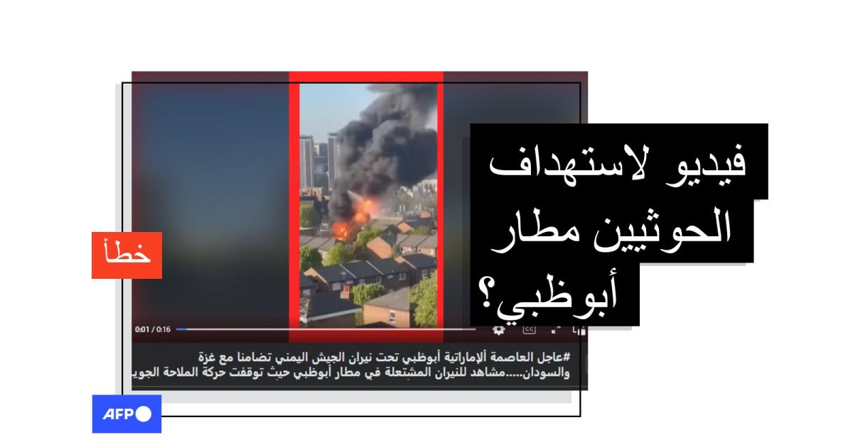 انتشر على مواقع التواصل الاجتماعي فيديو قيل إنه لمطار العاصمة الإماراتية أبوظبي أثناء تعرّضه لقصف حديث من قبل المتمرّدين الحوثيين في اليمن تضامناً مع قطاع غزة. إلا أن الادعاء غير صحيح، فالفيديو لا علاقة له بالإمارات، وهو في الحقيقة لحريق اندلع في محطة كهرباء في لندن.