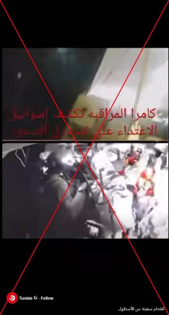 يظهر الفيديو عسكريين يقتحمون ما يبدو أنّها سفينة. وجاء في التعليق المرافق "كاميرا المراقبة تكشف الاعتداء على أسطول الصمود".