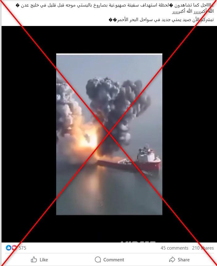 يصوّر الفيديو اشتعال النيران وتصاعد سحب كثيفة من الدخان على متن سفينة وسط البحر. وقال ناشرو الفيديو إنهّ يصوّر "لحظة استهداف الحوثيين سفينة إسرائيليّة في خليج عدن" أخيراً.