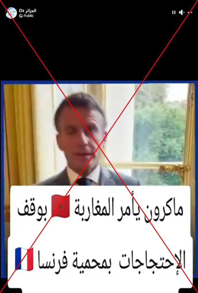 وعلّق ناشرو الفيديو بالقول إن ماكرون يدعو لوقف الاحتجاجات القائمة في المغرب حالياً.