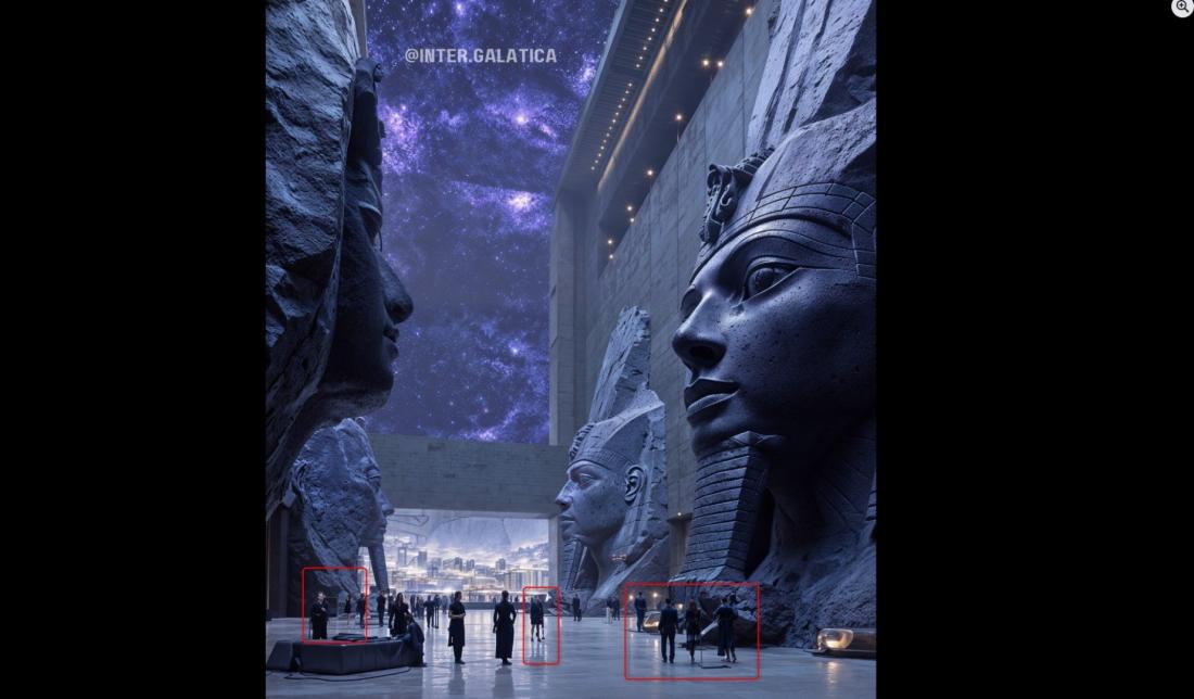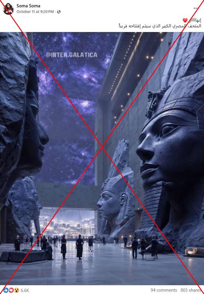 تظهر الصورة ما يبدو أنّها تماثيل فرعونيّة ضخمة داخل صالة. وجاء في التعليق المرافق "المتحف المصري الكبير الذي سيتم افتتاحه قريباً".