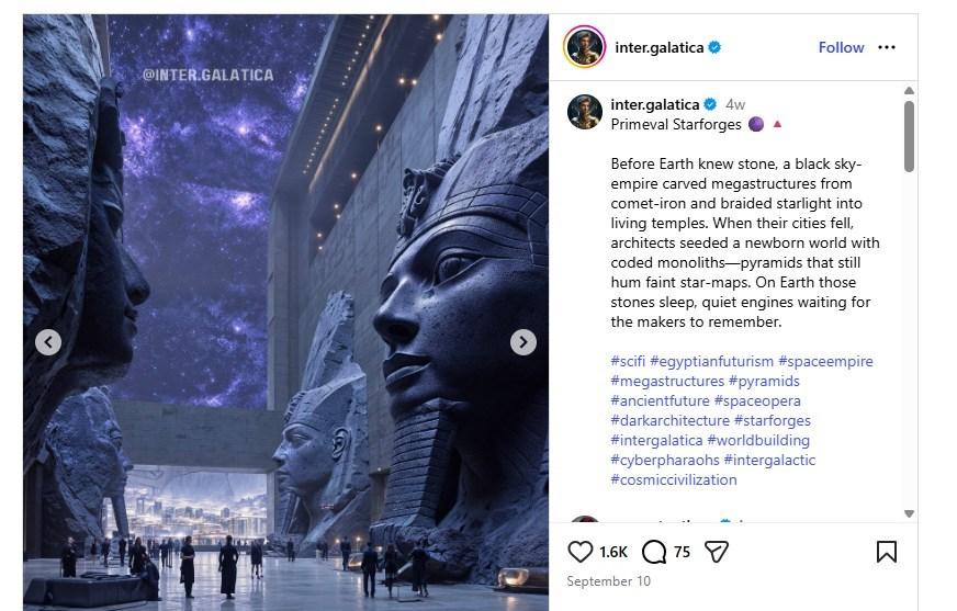 على ضوء ذلك، أرشد البحث إلى أنّ الصورة نشرت على صفحة Inter Galatica المتخصّصة بنشر تصاميم متخيّلة باستخدام الذكاء الاصطناعي في فيسبوك وإنستغرام. (أرشيف 1-2)
