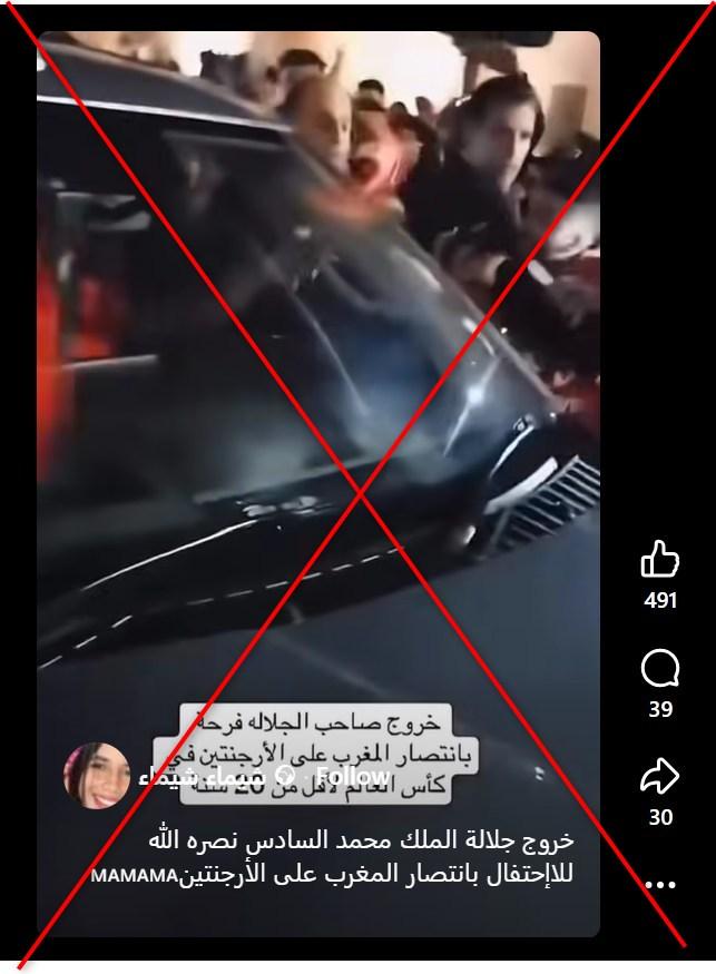 بعد تتويج المنتخب المغربي بلقب مونديال تحت 20 عاماً في كرة القدم بفوزه المستحق على الأرجنتين، انتشر على موقع التواصل الاجتماعي مقطع فيديو زعم ناشروه أنّه لخروج العاهل محمّد السادس للاحتفال مع الشعب بهذا الفوز. إلا أنّ الفيديو قديم ويعود لنزول الملك عام 2022 للاحتفال مع الشعب بتأهل منتخب بلاده إلى ربع نهائي كأس العالم.