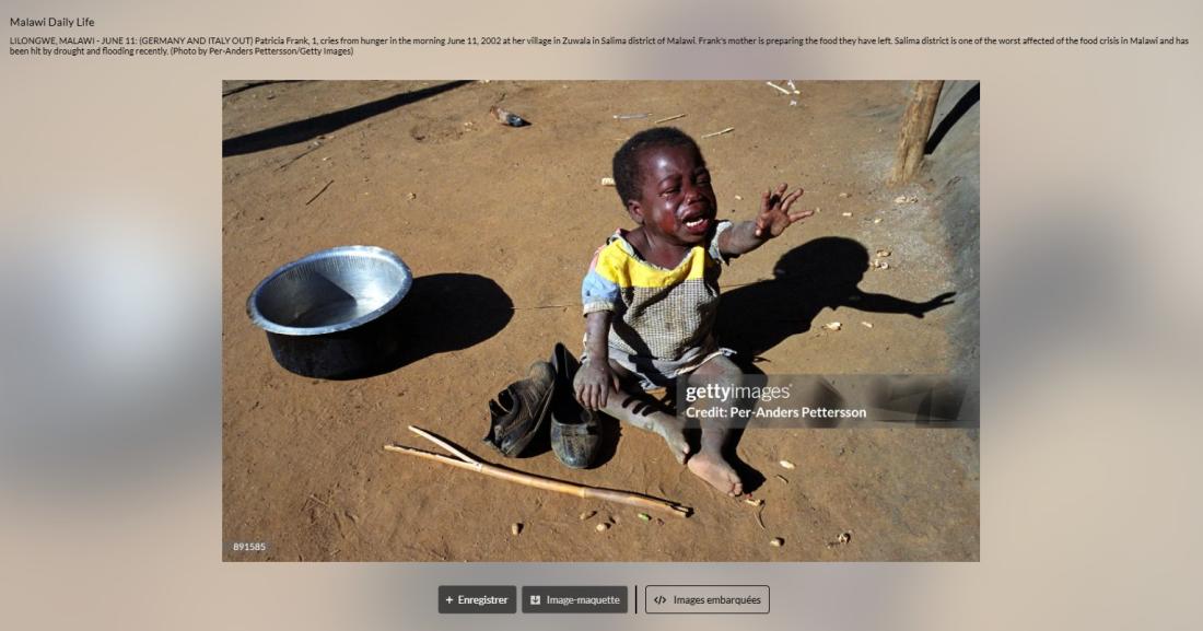والتقطت الصورة في 11 حزيران/يونيو 2002 لطفلة تدعى باتريسيا فرانك تبكي من الجوع في قريتها زوالا في ملاوي، الواقعة في قلب جنوب القارة الإفريقية.