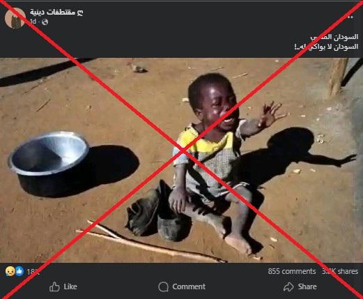 أسفرت الحرب في السودان عن مقتل عشرات الآلاف وتسببت بما وصفته الأمم المتحدة بـ"الأزمة الإنسانية الأسوأ في العالم" حيث يضطّر بعض السكّان إلى تناول جلود الأبقار للبقاء على قيد الحياة. في هذا السياق، انتشرت صورة على مواقع التواصل الاجتماعي ادعى ناشروها أنها لطفلٍ سودانيّ جائع. إلا أن الادعاء غير صحيح، فالصورة في الحقيقة مصوّرة في ملاوي عام 2002.