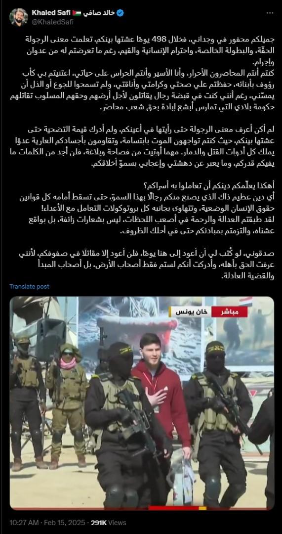 وأوضح صاحب المنشور في تعليقٍ أنّ هذه الرسالة هي محاولة منه "لتفسير لسان حال" الرهينة وكتب في تعليقٍ آخر: "تنويه وتوضيح: هذه ليست كلمات الأسير إنما كتبتها على لسانه توصيفًا لحاله وامتنانه وشكره وانحنائه لرجال المقاومة". (أرشيف)