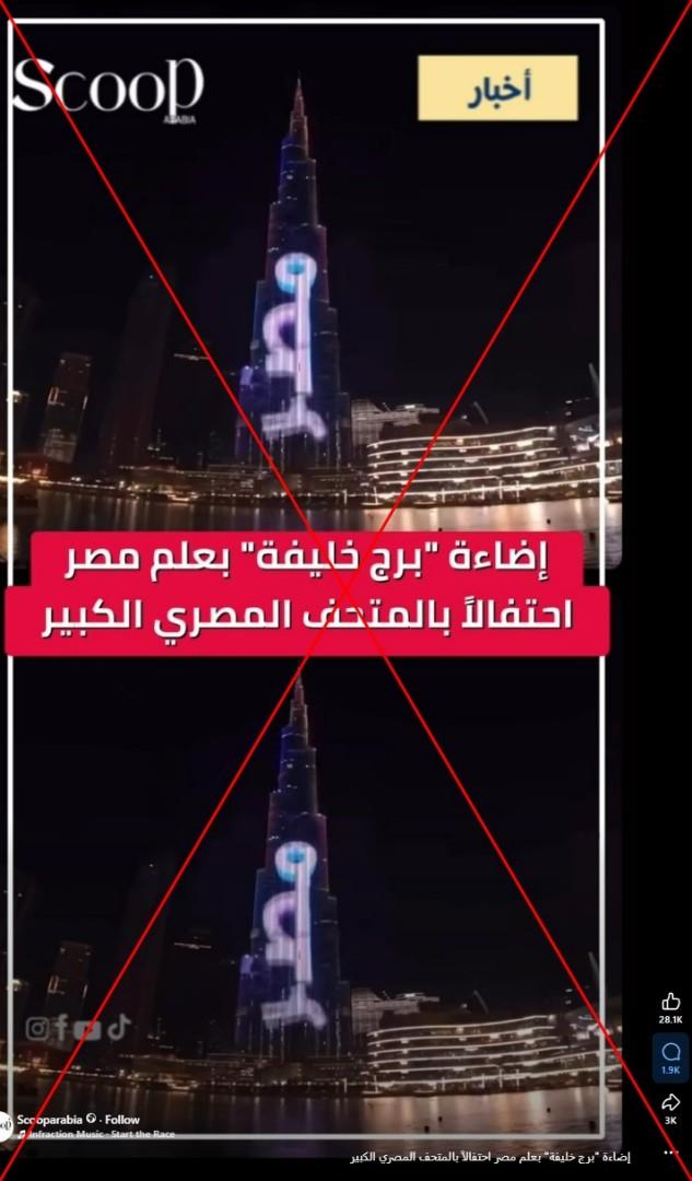 شهد العالم في الأول من تشرين الثاني/نوفمبر افتتاح المتحف المصري الكبير في القاهرة بحضور فعاليات رسمية وشخصيات عالمية. وعقب الافتتاح انتشر فيديو عبر مواقع التواصل الاجتماعي زعم ناشروه أنّه يظهر إضاءة برج خليفة في دبي احتفالاً بالمناسبة. إلا أن الفيديو في الحقيقة يعود للاحتفال بافتتاح شركة مصريّة عام 2023.