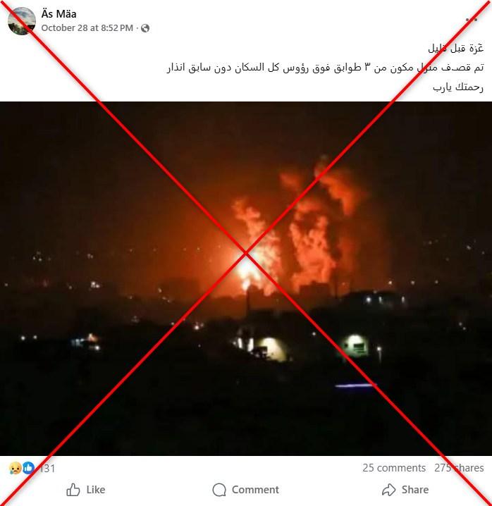 في 28 تشرين الأول/أكتوبر 2025، قالت إسرائيل إنها شنت غارات على عشرات الأهداف التابعة لحماس عقب مقتل جندي، وشهد قطاع غزة أعنف ليلة قصف منذ دخول هدنة بوساطة أميركية حيز التنفيذ. في هذا السياق تداول مستخدمون لمواقع التواصل الاجتماعي صورة قيل إنّها توثّق هذا القصف. إلا أنّ الصورة قديمة، وقد التقطها مصوّر وكالة فرانس برس في نيسان/أبريل 2022.