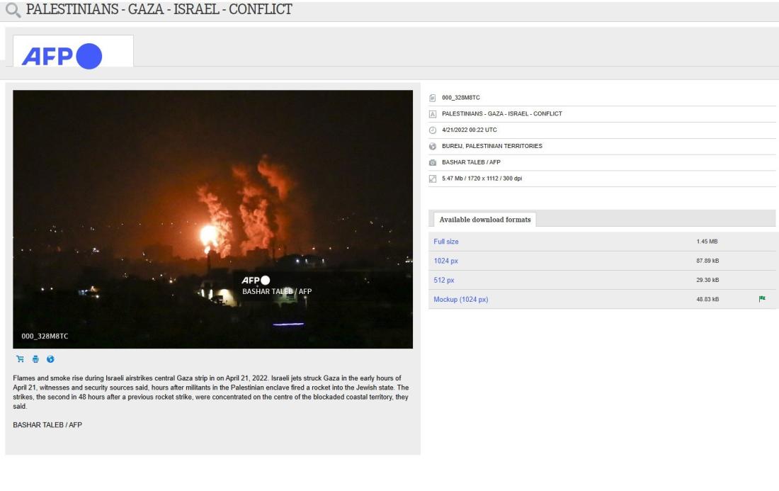 فالصورة وزّعتها وكالة فرانس برس في 21 نيسان/أبريل 2022، وهي تظهر تصاعد النار والدخان إثر غارات جويّة إسرائيليّة على قطاع غزّة بعد ساعات على إطلاق صاروخ من القطاع باتجاه المناطق الإسرائيلية.