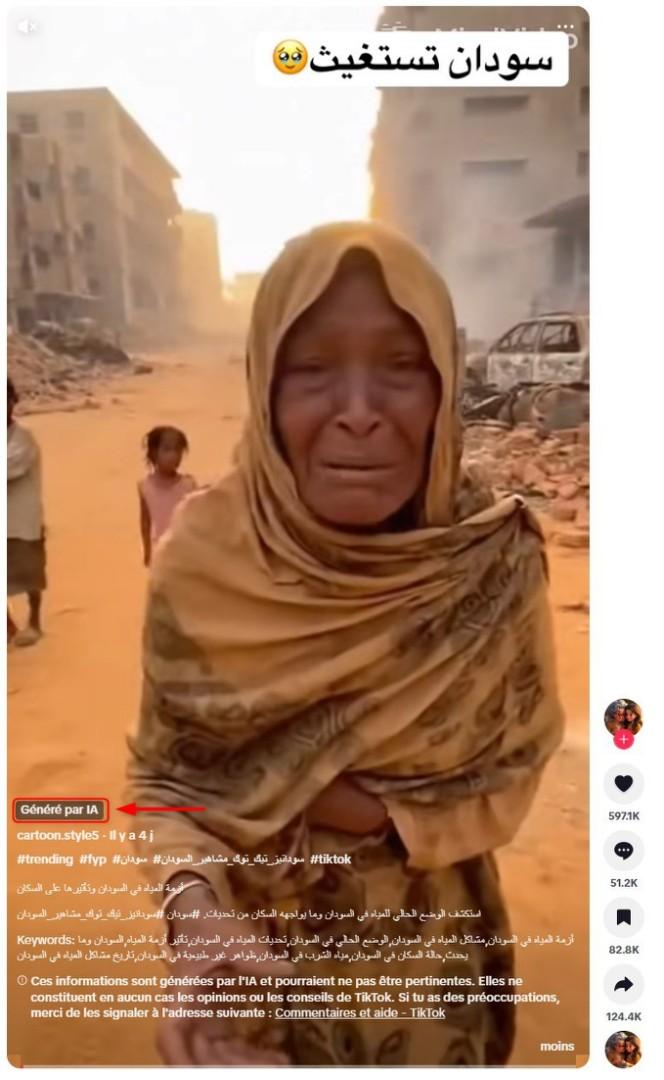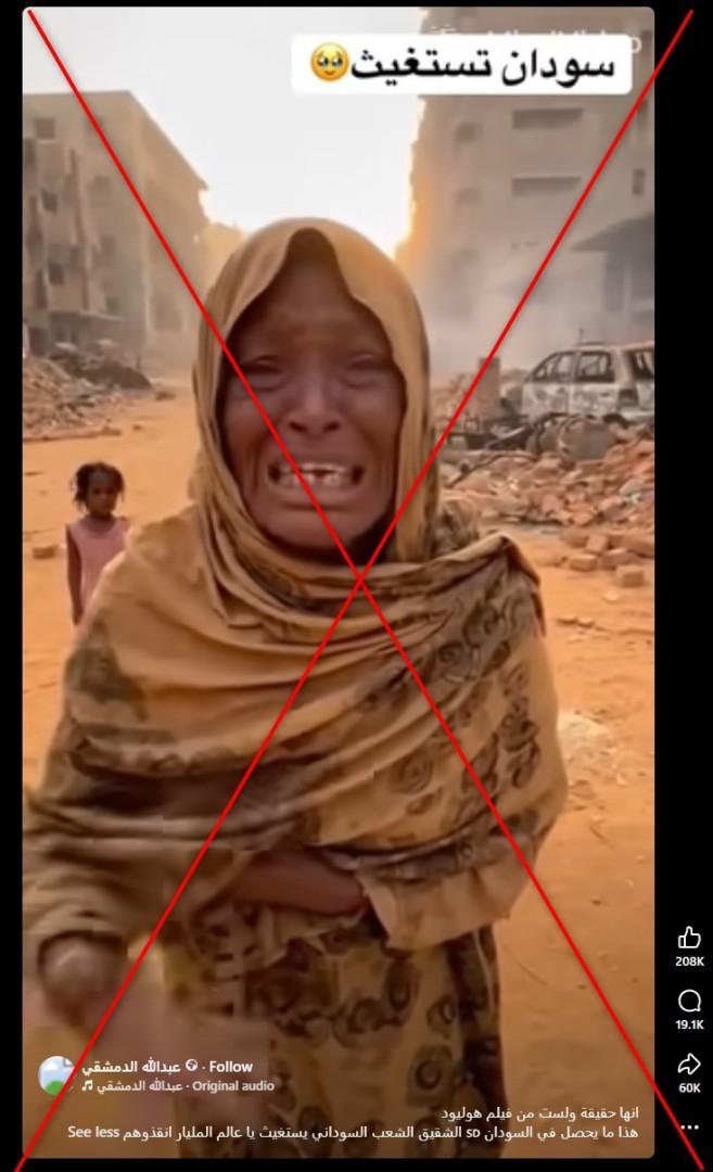 هذا الفيديو لسيّدة تستغيث مولّد بالذكاء الاصطناعي وليس لمشهدٍ حقيقيّ من السودان