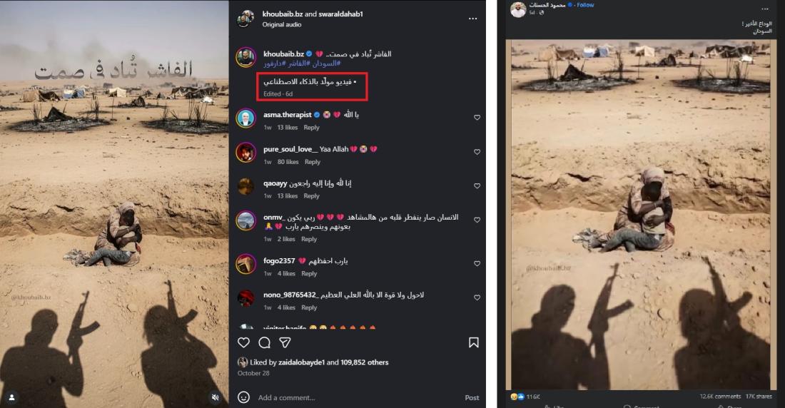 منذ سقوط مدينة الفاشر، آخر معاقل الجيش السوداني في إقليم دارفور، بيد قوات الدعم السريع توالت شهادات عن إعدامات ميدانية وعنف جنسي وهجمات على عمّال الإغاثة وعمليات نهب وخطف. في هذا السياق، انتشرت صورة على مواقع التواصل الاجتماعي ادعى ناشروها أنها لسيّدة تحتضن طفلها خشية من تعرضهما للقتل. إلا أنّ الصورة في الحقيقة مولّدة بواسطة الذكاء الاصطناعي.