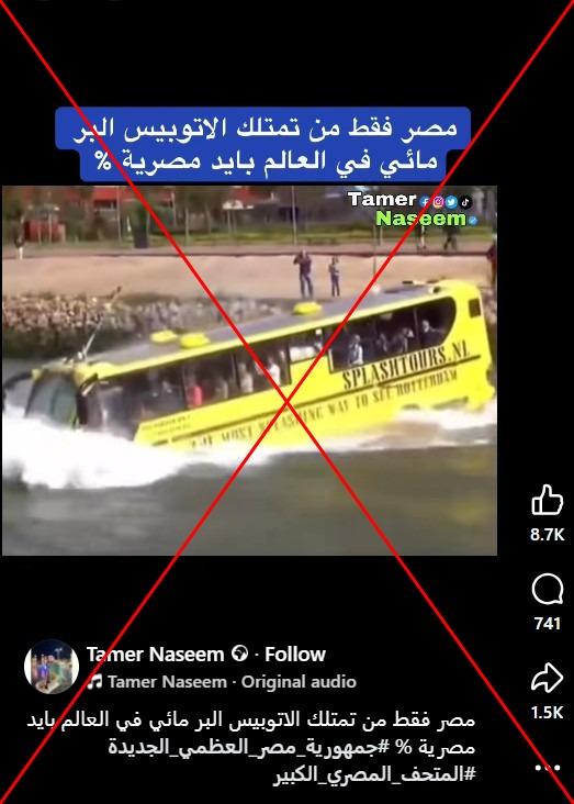 بعد إعلان مواقع إخباريّة مصريّة عن إجراء تجارب لحافلات برمائية تمهيداً لتشغيلها في مصر، تداول مستخدمون لمواقع التواصل الاجتماعي فيديو قيل إنه يظهر تشغيل هذه الحافلات، مع الادعاء بأن مصر هي الدولة الوحيدة التي تمتلك هذا النوع من المركبات في العالم. إلا أنّ الفيديو في الحقيقة يعود لمركبات برمائيّة من دولٍ عدّة ومصر ليست الدولة الوحيدة التي تملك هذا النوع من الحافلات.