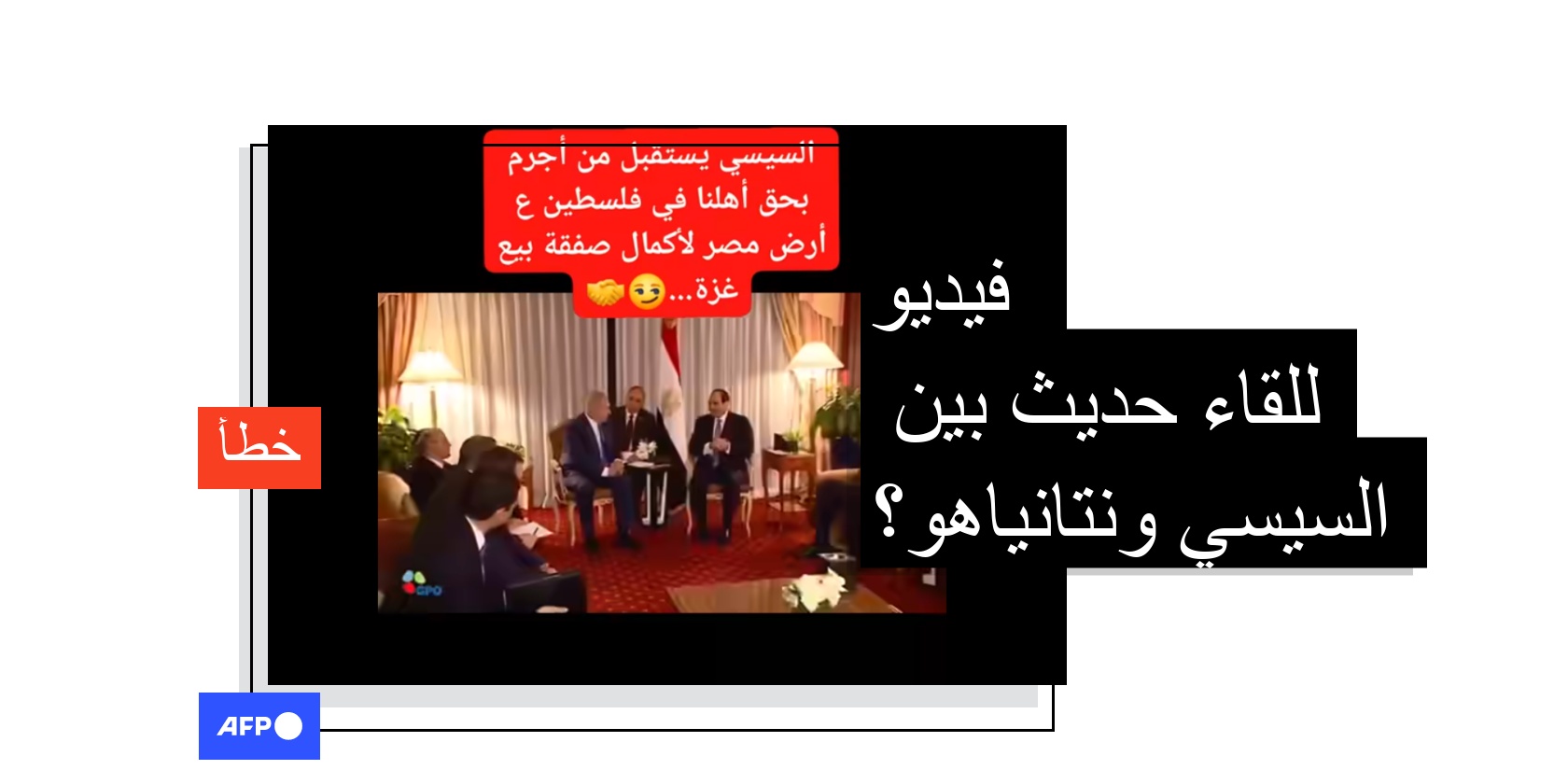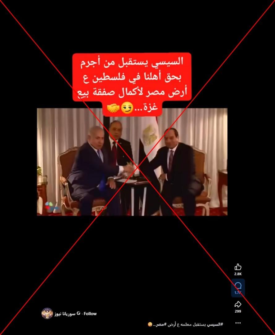 صوّت مجلس الأمن الدولي في 17 تشرين الثاني/نوفمبر على مشروع قرار أميركي يدعم خطة الرئيس دونالد ترامب للسلام في غزة التي تتضمن نشر قوة دولية ومساراً إلى دولة فلسطينية. غداة ذلك تداول مستخدمون لمواقع التواصل الاجتماعي فيديو زعم ناشروه أنّه يظهر الرئيس المصريّ عبد الفتاح السيسي مستقبلاً رئيس الوزراء الإسرائيلي بنيامين نتانياهو في مصر. إلا أنّ الفيديو في الحقيقة يعود للقاء جمعهما عام 2017 في نيويورك على هامش أعمال الجمعية العامة للأمم المتحدة.